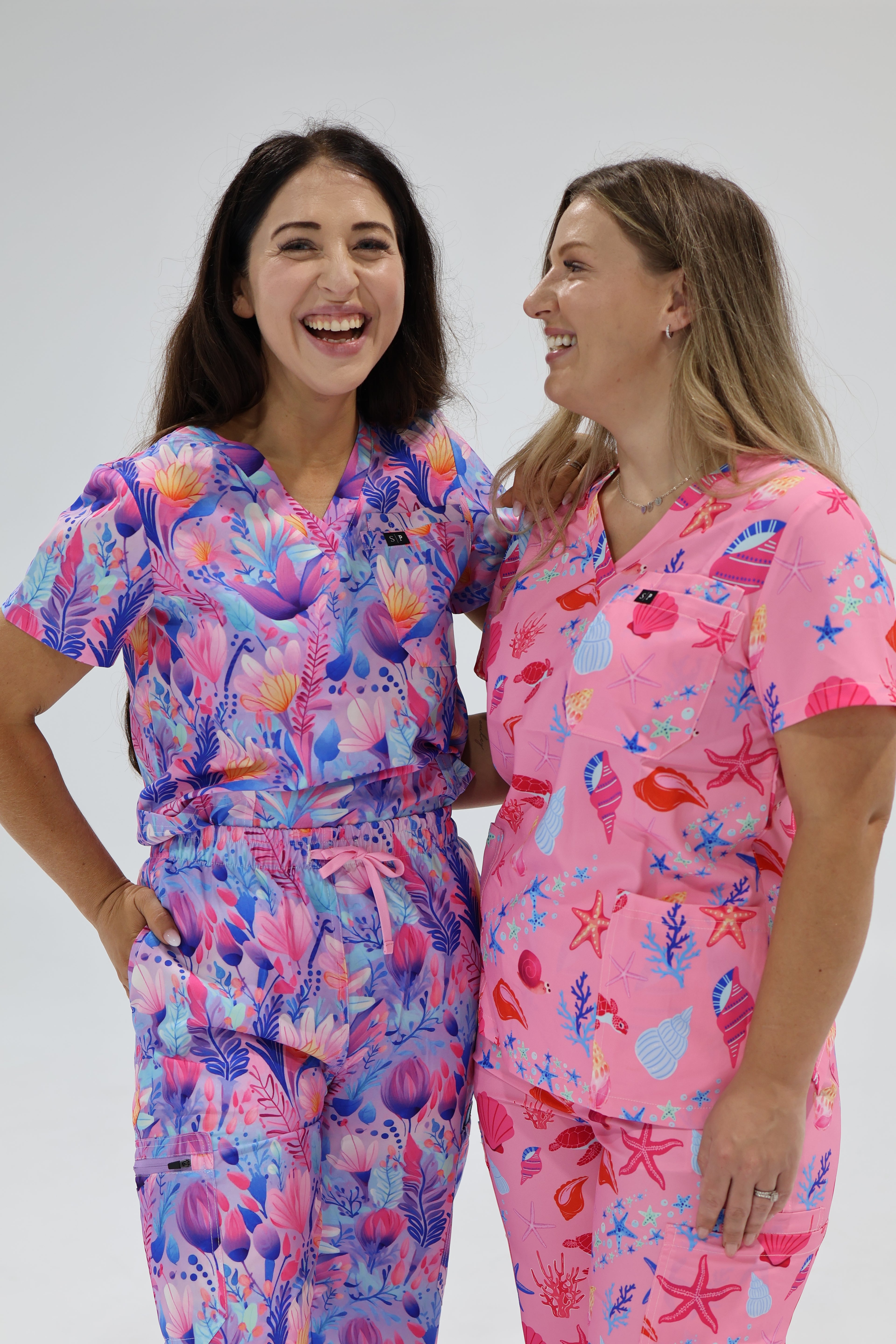 Hi there! Thank you for your feedback on our Tutti Frutti Scrub Set. We appreciate your input and we will definitely take your suggestion into consideration for future improvements. In fact all new designs and sets have a longer inseam now. We're glad you love the colors and pattern! Have a great day!