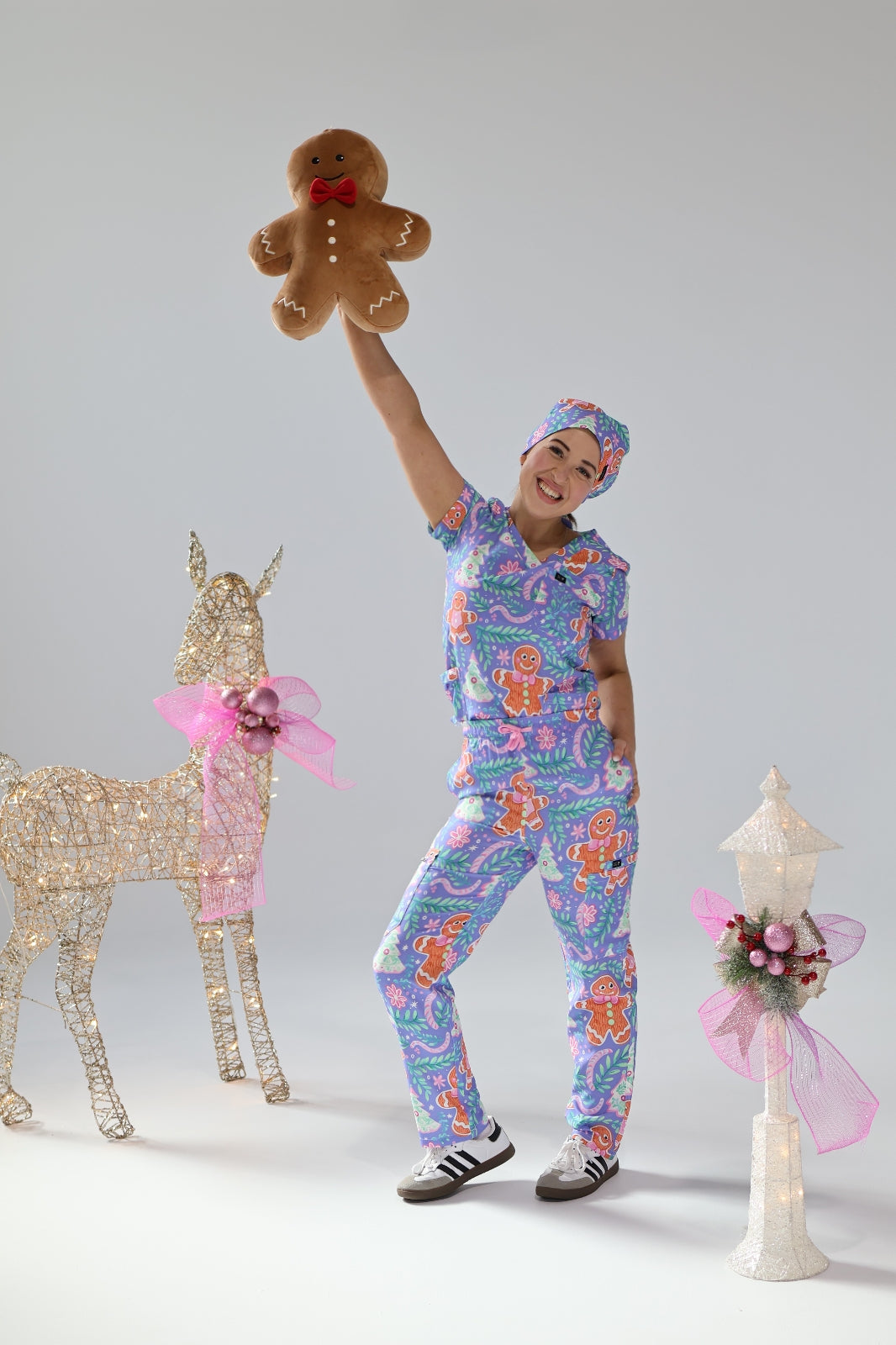 "Whether it’s an afternoon pick-me-up or a festive sweet treat, nothing says Christmas quite like gingerbread. Our Gingerbread Scrub Set takes this classic favourite and gives it a playful twist—set against a gorgeous pastel purple that’s anything but ordinary. Fun, fresh, and full of holiday spirit, this set is designed to brighten your shifts and spread joy all season long. Perfect for nurses who love to bring colour, cheer, and a touch of sweetness to the ward.".